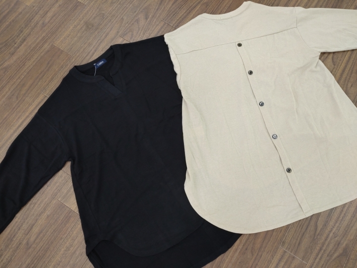 再入荷しました!!! 今年4月に入荷・・即完売致しましたバックボタン!キーネックのプルオーバー ラウンドヘムのオシャレなプルオーバーです 着丈前70 後79.5 身幅55 ブラック・ベージュ 税込¥1890コーナーにて SOLD OUT