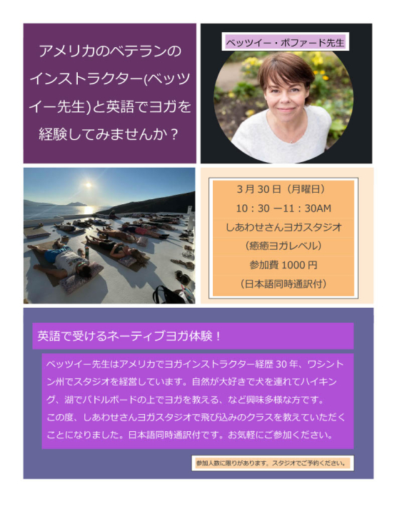 アメリカでヨガインストラクターをなされているベッツィー先生はインストラクター歴30年のベテランでありワシントン州でスタジオも経営している素晴らしい先生です。